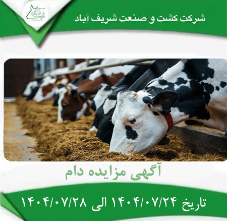 شرکت کشت و صنعت شریف آباد در نظر دارد تعدادی دام به شرح زیر از طریق مزایده عمومی به فروش برساند. ۱- تعداد ۱۰۰ رأس